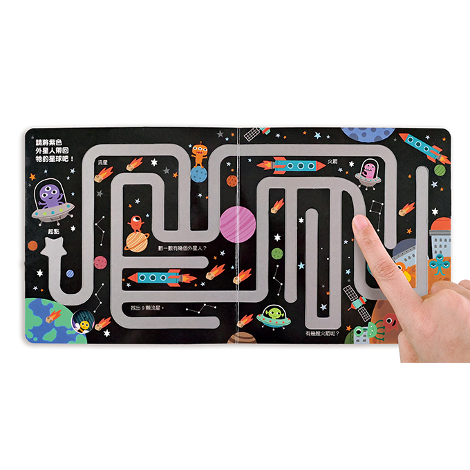 專為孩子小手指設計的迷宮凹槽,能讓孩子輕鬆放入手指走迷宮,為閱讀增添遊戲性。