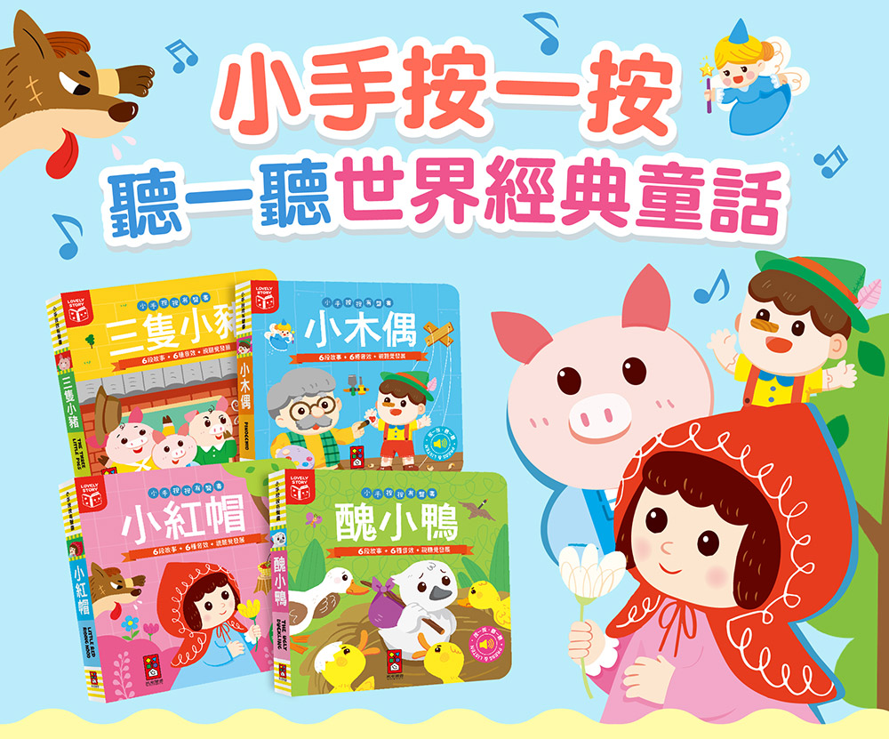 小手按一按,聽一聽三隻小豬的聲音!在這本書裡,孩子不只可以聽到完整的故事內容,還可以聽見豬大哥的打呼聲、豬小弟蓋房子的聲音還有大野狼吹房子呼呼的聲音,逼真的音效讓故事活了起來,帶給孩子身歷其境的感受,彷彿走進童話世界之中!
