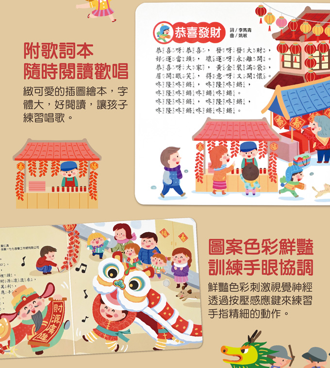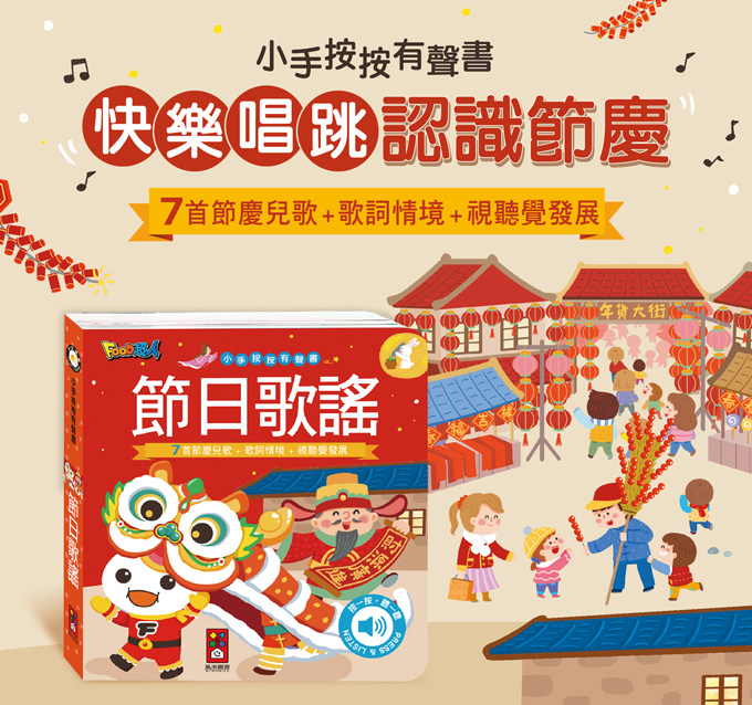 小手按一按,寶寶立即能聆聽七首節慶歌曲,認識台灣重要的節日──新年、元宵節、端午節及中秋節。其中,經典的過年歌曲《財神到》取得正式授權,讓這首傳唱已久的經典曲目也能進入小寶貝的生活中!