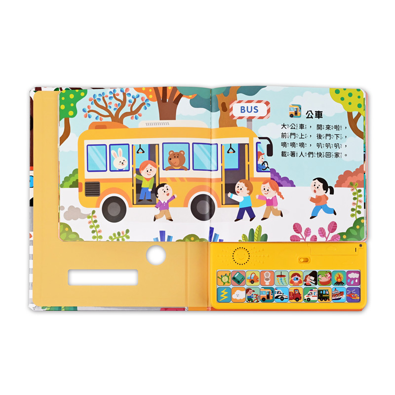 朗朗上口的念謠搭配生動的插圖,讓寶寶認識生活物品、樂器、大自然和交通工具的特色,按第二下按鍵,還可以聆聽逼真的音效,刺激孩子的視覺與聽覺,陪孩子一起學認知!