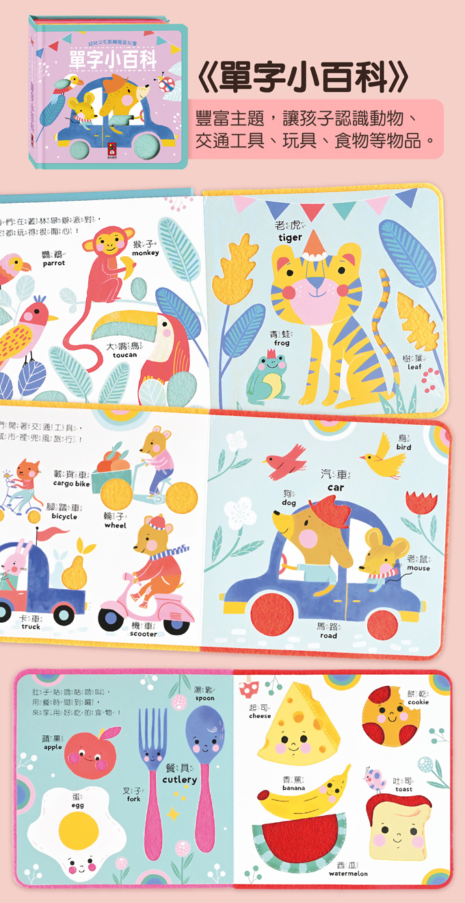 內頁繽紛鮮豔的色彩,給予寶寶視覺上的刺激,提升閱讀的吸引力。用手摸一摸嵌入的羊毛氈與形狀,能充分刺激觸覺神經,增加敏銳度。透過親子共讀,唸一唸中英文單字,讓寶寶學習認知,增加語言發展。