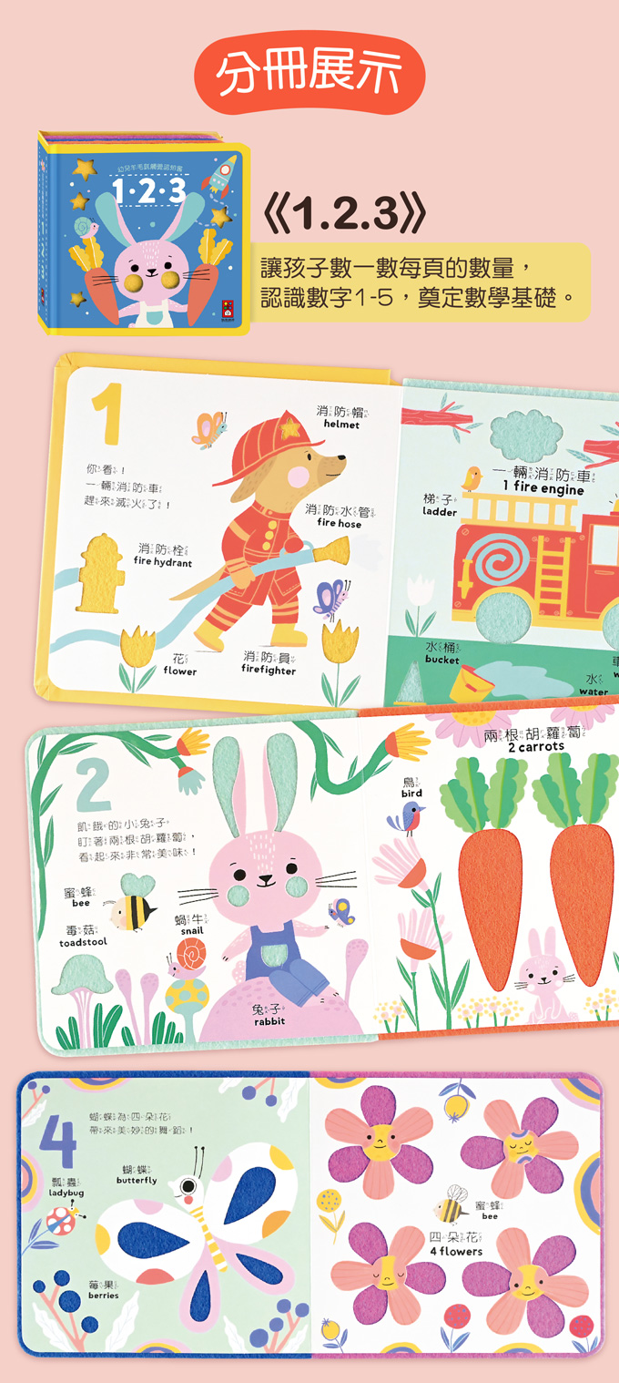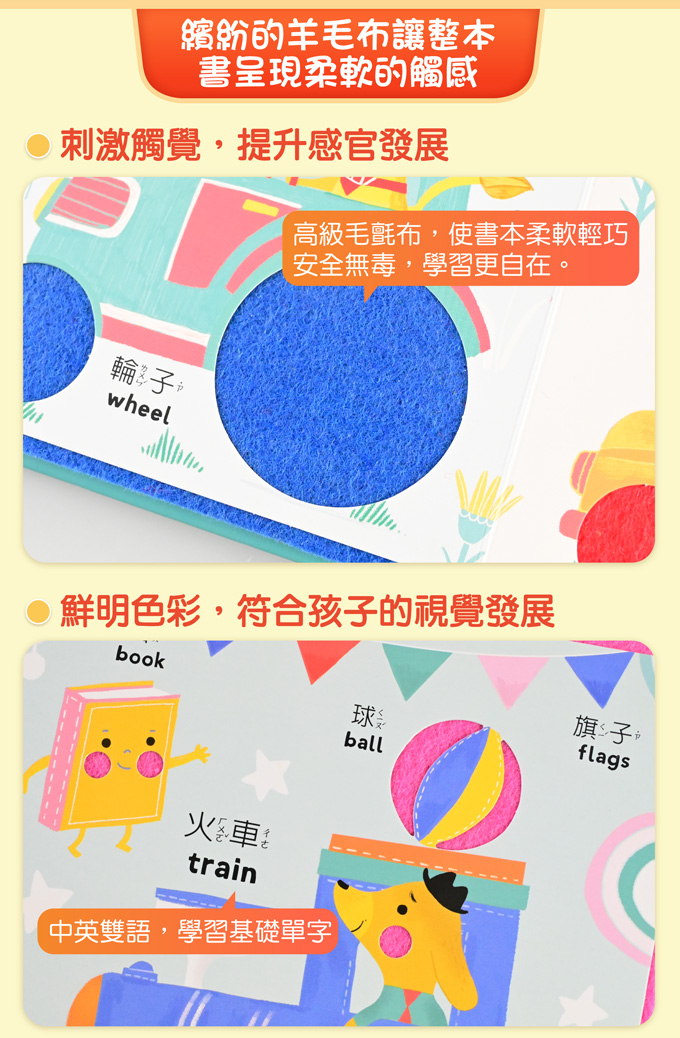 內容介紹: 觸覺遊戲能刺激大腦發育,提升寶寶的感官智能。本書選用高級毛氈布,替代傳統EVA泡棉材質,使書本柔軟輕巧,安全無毒,適合給0歲的寶寶使用。   內頁繽紛鮮豔的色彩,給予寶寶視覺上的刺激,提升閱讀的吸引力。用手摸一摸嵌入的羊毛氈與形狀,能充分刺激觸覺神經,增加敏銳度。透過親子共讀,唸一唸中英文單字,讓寶寶學習認知,增加語言發展。 ■ 商品特色 1. 毛氈材質,輕巧柔軟舒適  書本柔軟,鮮豔的毛氈布無安全上的疑慮,學習更自在。 2. 刺激觸覺,提升感官發展  透過觸摸羊毛氈,訓練幼兒觸覺發育,加速智力成長。 3. 學習1-5,建立數量概念  讓孩子數一數每頁的數量,認識數字1-5,奠定數學基礎。 4. 中英雙語,學習基礎單字  在牙牙學語時提供孩子語言刺激,練習發音,訓練說話能力。 5. 親子共讀,增加親密互動  適合親子共讀,一起觸摸感受與互動,讓親子關係更緊密。 ■ 商品功能 ★透過撫摸不同形狀的羊毛氈布,訓練幼兒觸覺發展。 ★插圖童趣,鮮明的色彩刺激視覺,並培養美感鑑賞力。 ★圖文對照,大字附注音,學習識字,培養數學及語文能力。 ★封面精裝圓角,內頁為羊毛布+厚紙板材質,柔軟又防水。