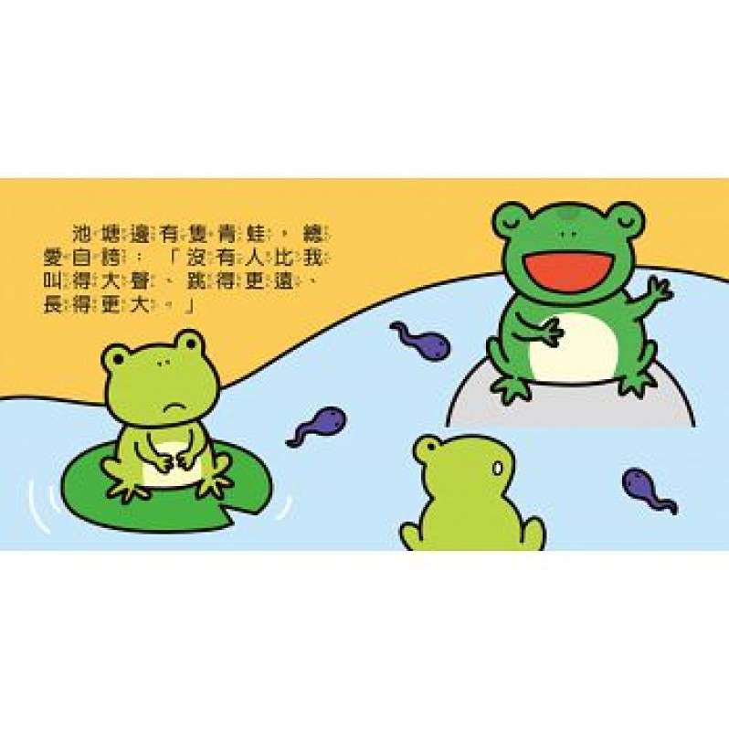 一隻自大的青蛙吹著肚皮,想要讓自己脹得比牛還大,牠吹啊吹啊,肚皮真的會比牛大嗎?