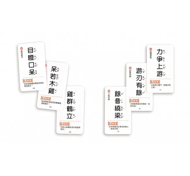 3. 小知識家:牌組放中央,其中一人抽,另一位回答成語的解釋,回答出來將成語卡給對方,回答不出的話則棄牌,牌多者勝。