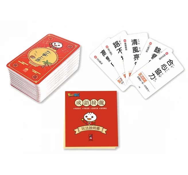 1. 成語接龍:每人分10張卡片,從大牌組抽一張當首張,看誰能接,若都沒得接,則輪流抽取2張,先出完手上成語接龍卡的人勝利。