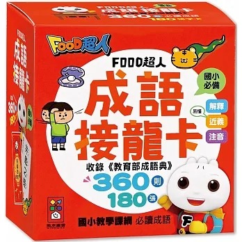 《FOOD超人成語接龍卡》內含180張共360則成語,每張成語卡都有近義成語與成語解釋,讓孩子在遊戲過程中也能清楚了解成語意義,在遊戲中學習。成語卡正反面皆可遊戲,能促進孩子手眼協調,訓練反應能力,幫助孩子奠定良好的語文基礎。