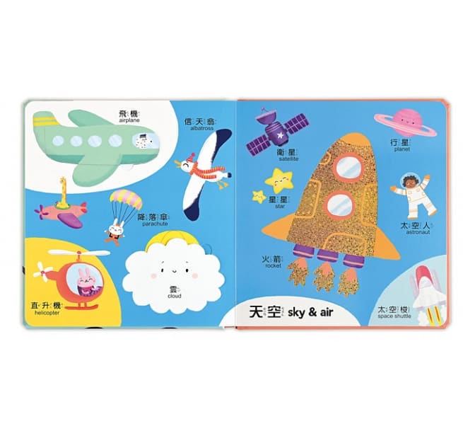 全套中英對照,共可學習400個以上的雙語單字,透過親子共讀,建立孩子的詞彙與生活認知,訓練口語溝通發展。
