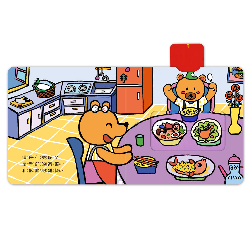 吃飯時間到!餐桌上有什麼樣的食物呢?本書利用不同的互動機關,讓孩子能在閱讀過程中動動手指,身歷其境,可愛的插圖吸引孩子目光,配上大字型加注音,淺顯易懂的文字,讓低幼齡孩童也能輕鬆閱讀。