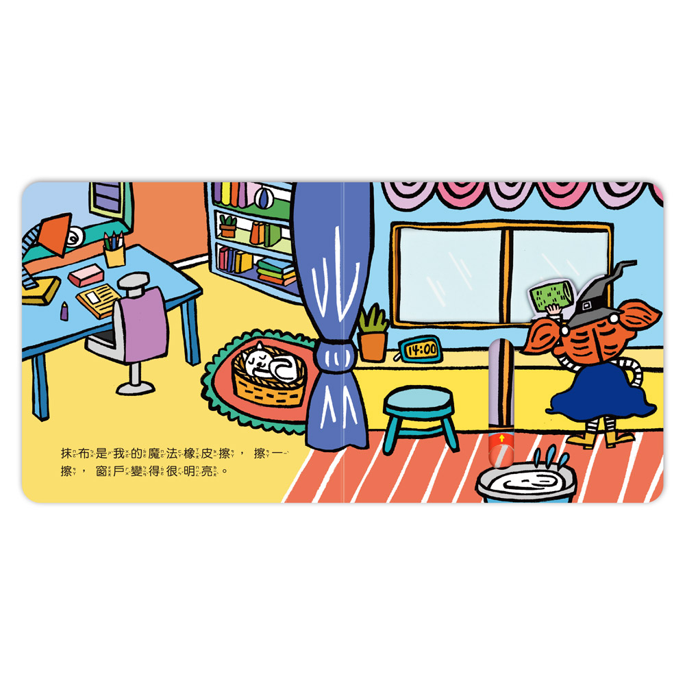 我是家裡的魔法師,打掃家裡我最厲害了!要怎麼打掃呢?本書利用不同的互動機關,讓孩子能在閱讀過程中動動手指,身歷其境,可愛的插圖吸引孩子目光,配上大字型加注音,淺顯易懂的文字,讓低幼齡孩童也能輕鬆閱讀。