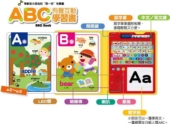 透過孩子小手按一按有聲書,跟著問題尋找答案的過程,學習認識英文字母、單字,學習數字與顏色的英文,讓學習成為一種好玩的遊戲。