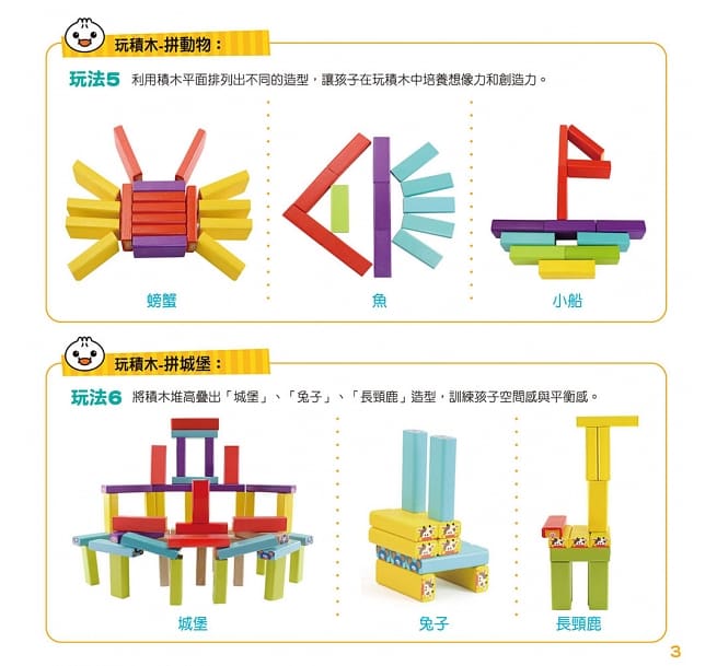 將積木堆高疊出「城堡」、「兔子」、「長頸鹿」等立體造型,訓練孩子的空間感與平衡感。