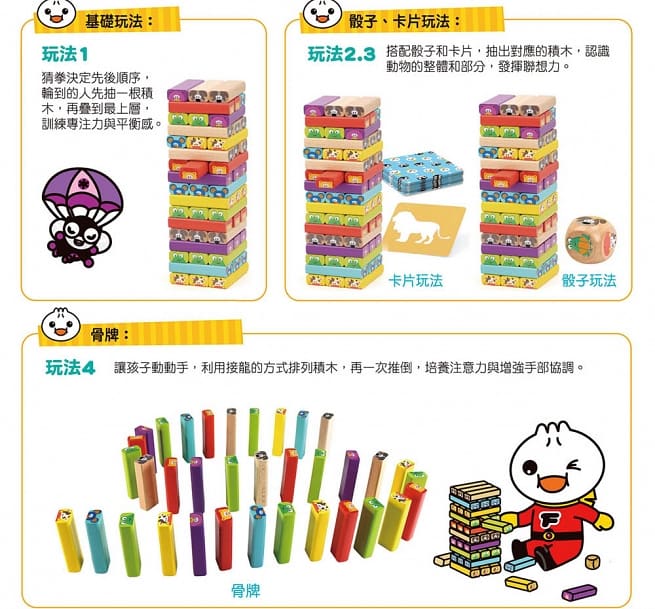 抽走一根積木,會不會倒呢?積木疊疊樂是一款經典的益智桌遊,透過堆疊和抽取積木,可以提升孩子眼與手的協調能力。此外,產品還包含1個骰子及24張遊戲卡片,辨別動物整體、部分、食物和影子,讓傳統的疊疊樂有更多的玩法。