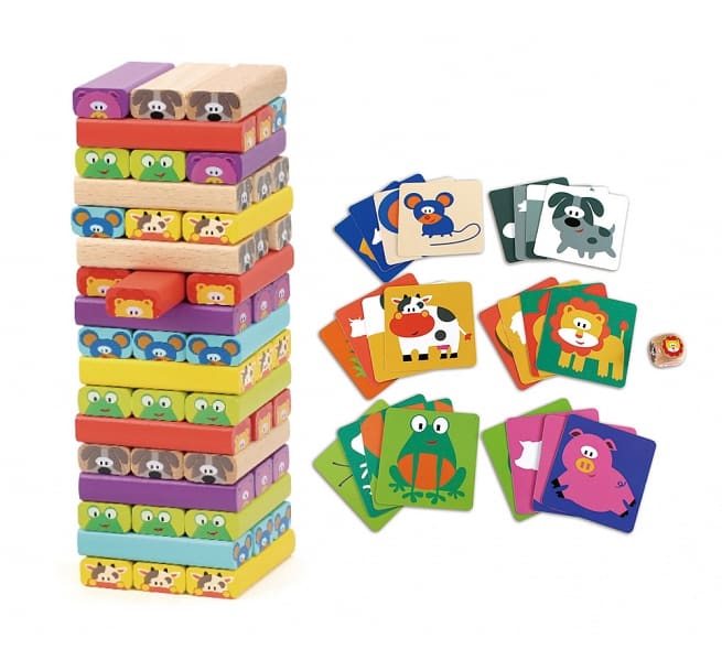 輪流骰骰子,並抽出與骰子圖案相同的積木,再疊到最上層,直到積木倒塌為止。