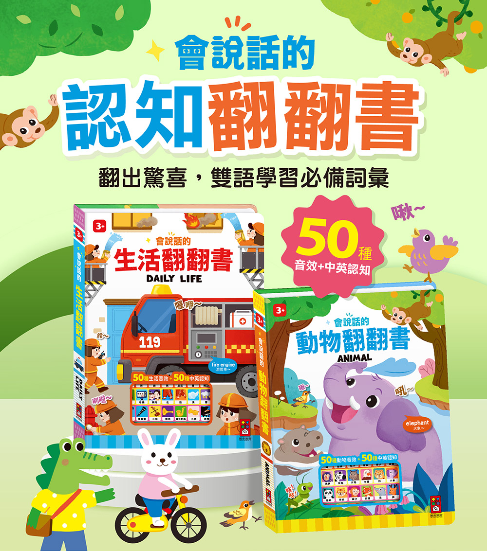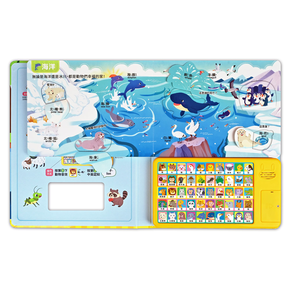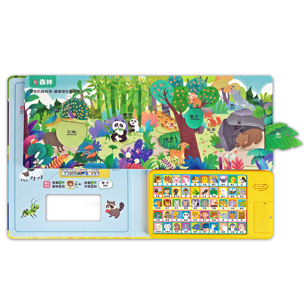 搭配1組動物聲效按鍵機,聆聽50種動物音效及50種中英認知,讓體驗更加生動。