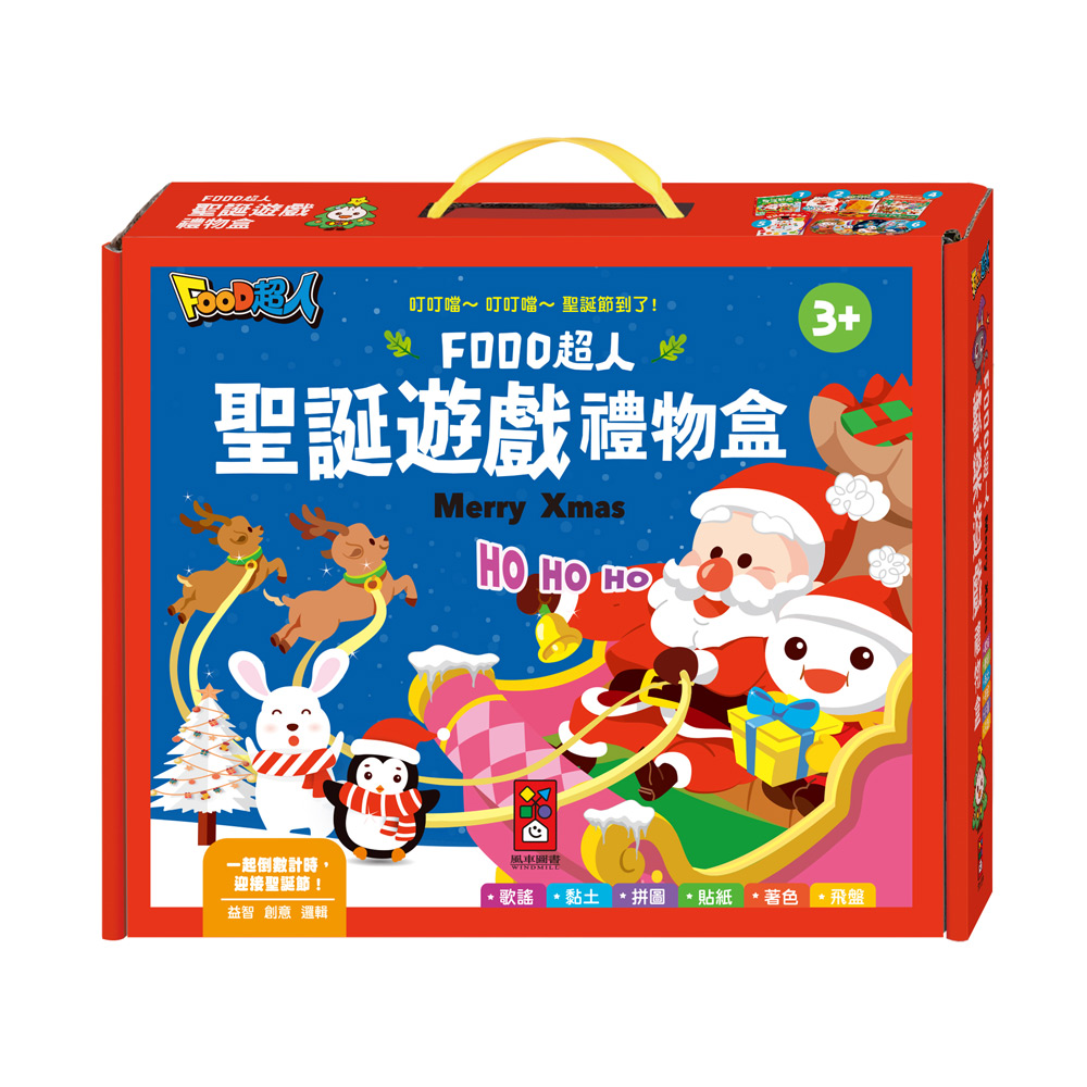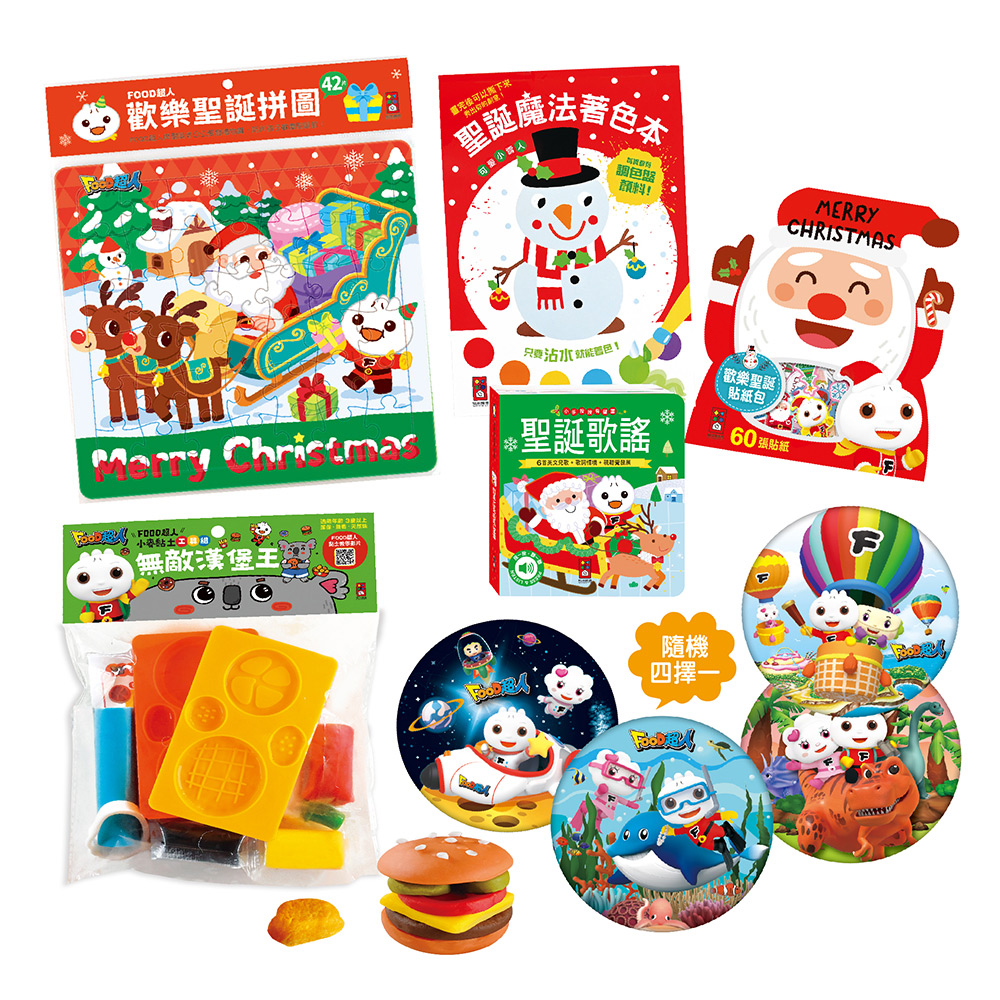 FOOD超人聖誕遊戲禮物盒》內含六種不同類型的商品,包含有聲音樂書、著色本、拼圖、黏土、軟飛盤與貼紙包,內容豐富,物超所值,陪伴孩子度過特別的聖誕節,同時培養孩子的視覺、聽覺、手眼協調與創意等能力,帶動全腦開發,提升全方位的發展,是聖誕交換禮物的最佳選擇!