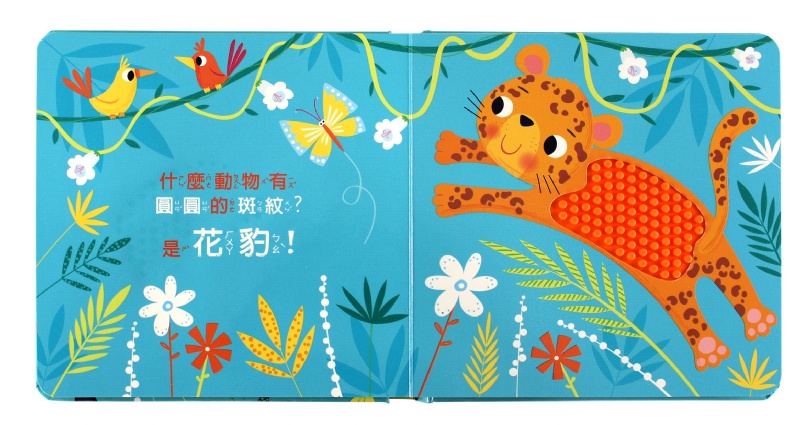 透過閱讀本書,孩子可認知各種動物,並觸摸牠們身上的矽膠,一起來說一說,動物身上摸起來是什麼感覺?訓練口說、觸覺,可在遊戲中多樣化學習。