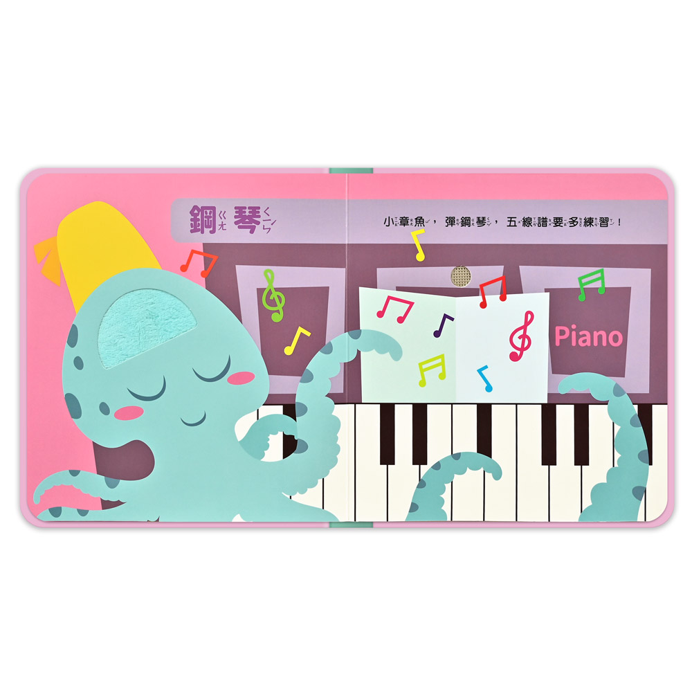 本書採小手點讀及首頁3D立體設計,每一跨頁都設定了不同樂器及情境,透過6組中英認知+6種觸摸+12段生動音效,只要指尖輕輕一按,就能讓孩子探索觸感、辨別聲音、連結視覺,在玩樂中認識各式各樣的樂器,交織出一場身歷其境的感官體驗。