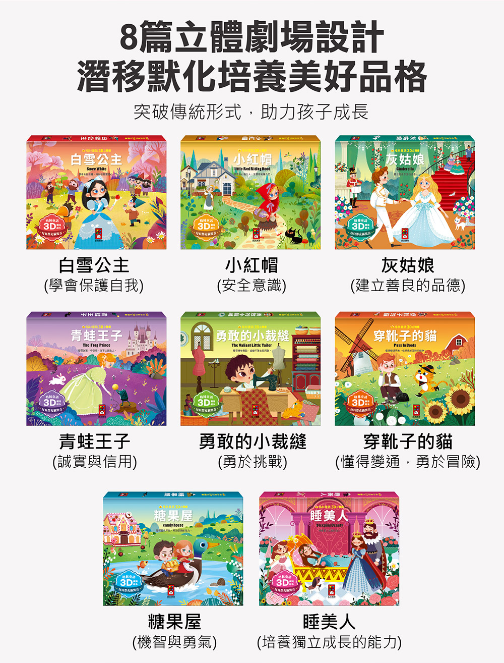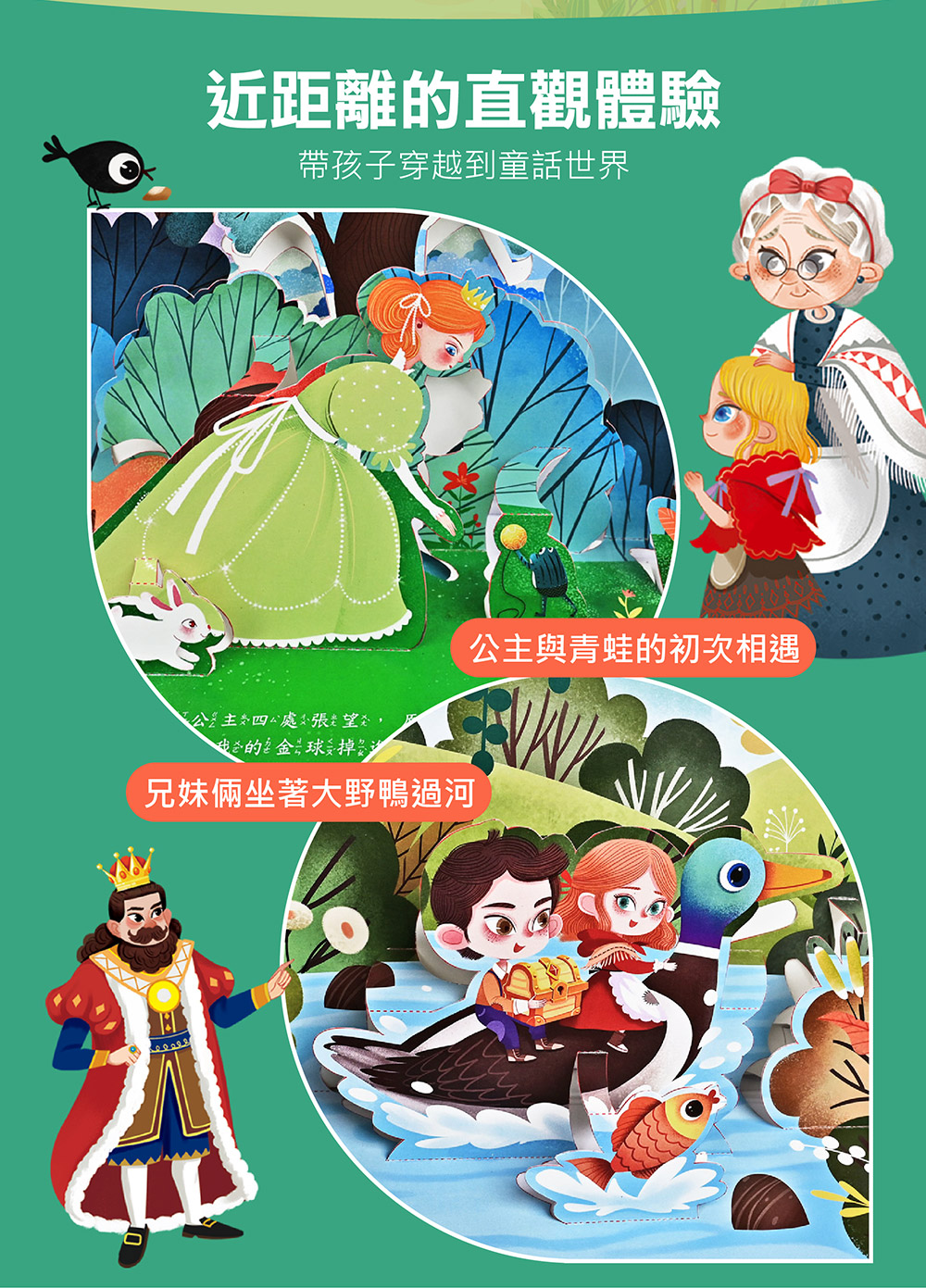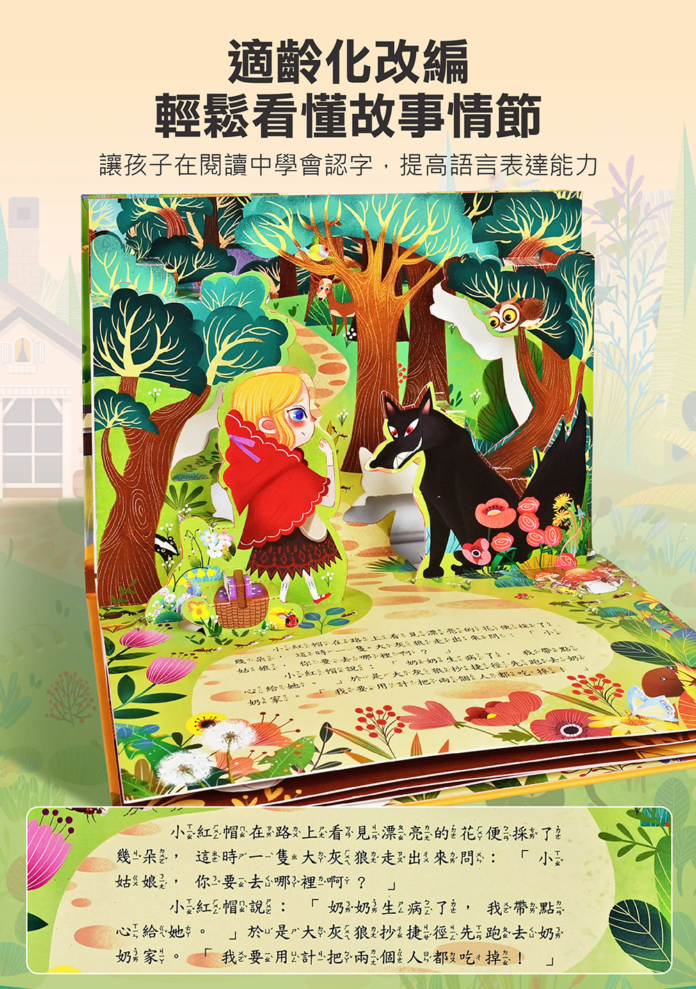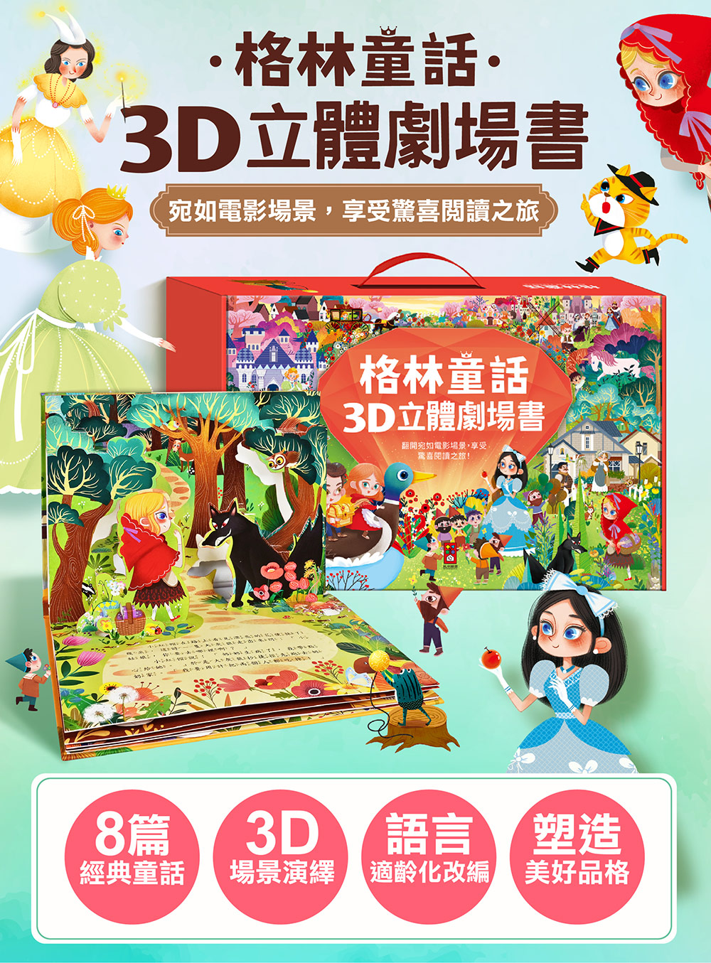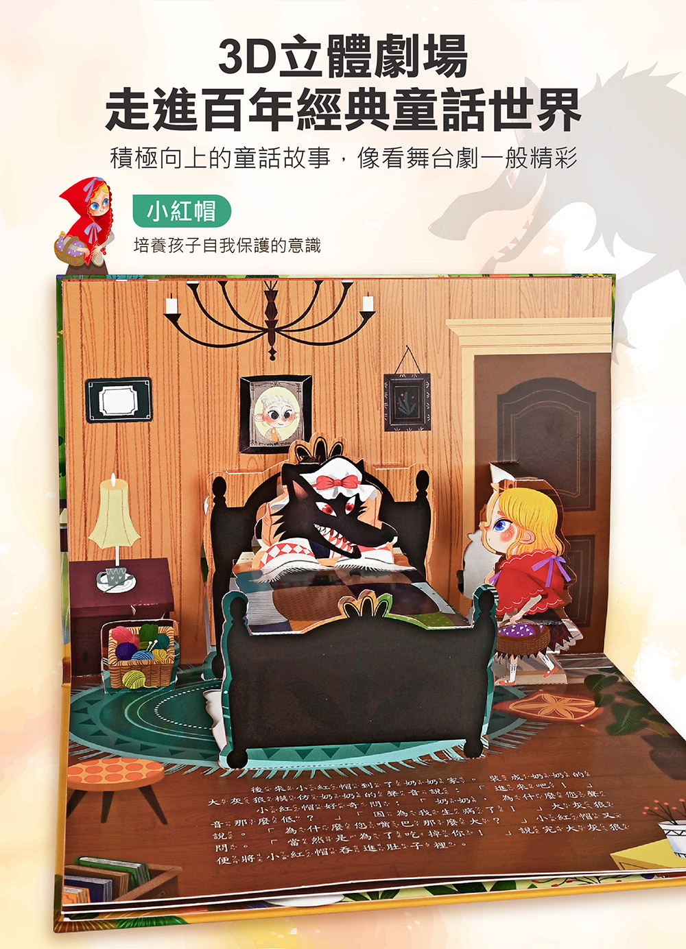 膾炙人口且經典的格林童話,利用簡單且生動的文字吸引孩子閱讀,精美的插圖加上多層次的3D立體剪裁,翻開即能展現立體效果,不僅能抓住孩子目光,同時刺激視覺發展,彷彿置身於童話世界中,享受驚喜的閱讀之旅。