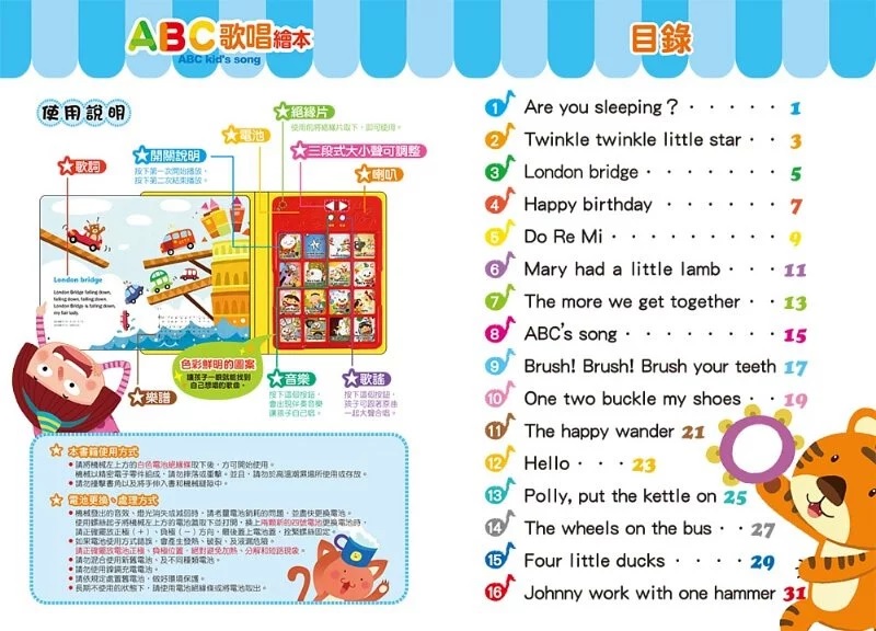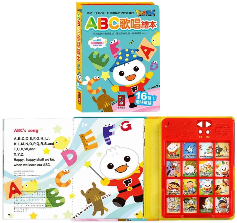 內容介紹: 打造專屬於幼兒的歌唱舞台,16首有趣輕快的ABC歌謠! 還可以歡唱卡拉OK! 耳熟能詳的動感童謠,讓孩子在歡唱中快樂學習ABC經典英文兒歌! 16首有趣輕快的ABC歌謠,搭配色彩豐富的歌謠繪本,強化幼兒與音樂間的互動功能,讓孩子能輕鬆進入歌曲情境。 歌謠以活潑多元的方式呈現,孩子可以自由選擇歌謠模式與伴奏模式,隨時都能輕鬆歡唱,打造專屬於自己的歌唱舞台,成為小小音樂家。