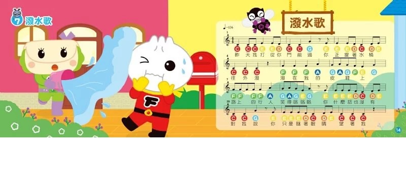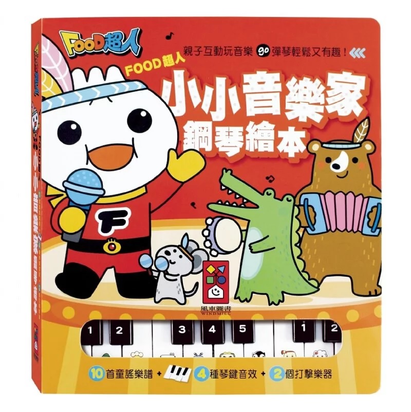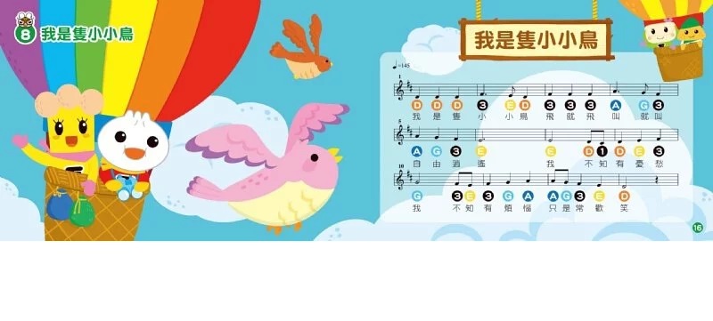 文字清楚呈現,並用7種顏色的音符詮釋兒歌,並標示黑白鍵高低音符,版面豐富繽紛而無閱讀壓力,讓孩子輕鬆「玩音樂」。