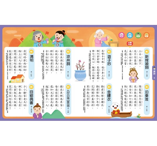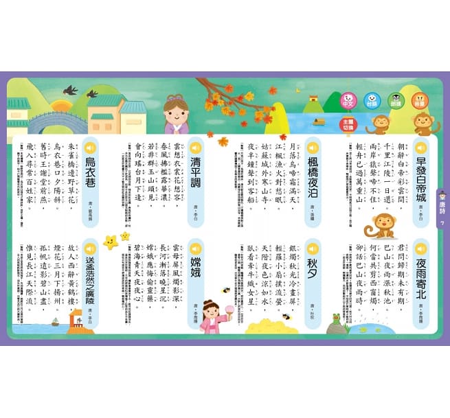 可同時學習32首唐詩、三字經全文及弟子規全文,國學經典一書在手,全都掌握。