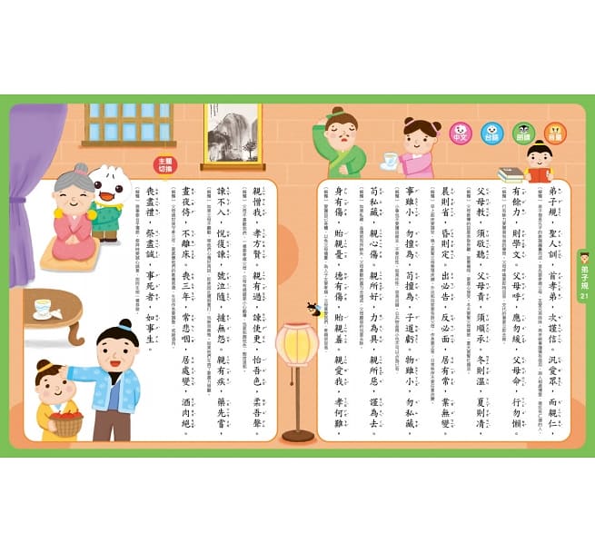 家長可以在旁協助孩子一起閱讀,同時補充說明國學知識教育,不僅可加深孩子對於文言句型的印象,同時亦可促進親子互動關係,拉近與親子之間距離,享受親子共讀時光!