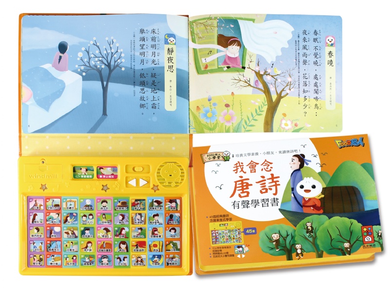 全書共45首古典詩詞,並附有符合意境的精美圖畫和淺顯易懂的白話文注釋以及有趣的亮閃閃LED燈,搭配每首詩的有聲按鍵,讓孩子更加理解詩詞的內容涵意,並反覆練習,體會古典詩詞的優美。