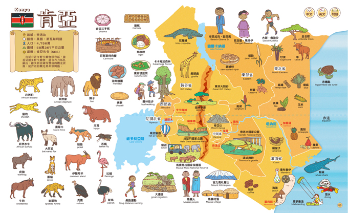 44幅完整的彩繪地圖標示出國家疆域及地理位置,建立起孩子對每一洲乃至每一國的基礎認識。