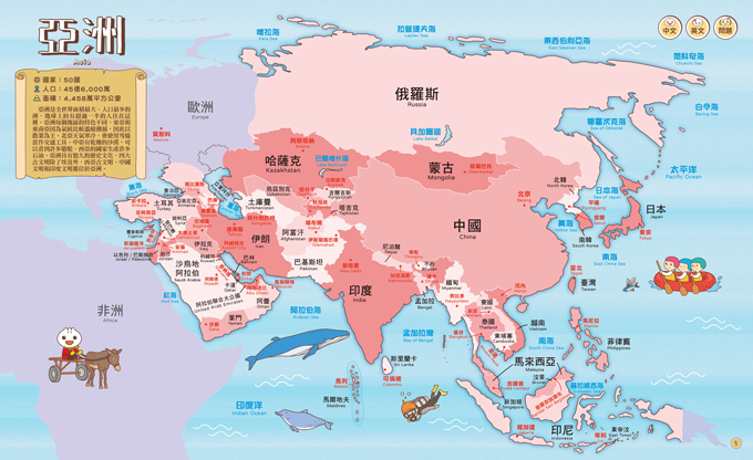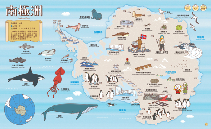 以清楚明確的插圖讓孩子認識不同國家和南北極的風土民情和特色,增加常識與知識。
