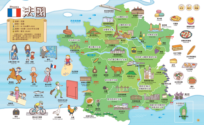 全書單字為中英雙語,不只能學習國家和首都的英文,所有的景點、食物等特色也都標示原文,培養出國必備的英語能力,讓艱深的原文單字不再成為國外旅行的負擔。