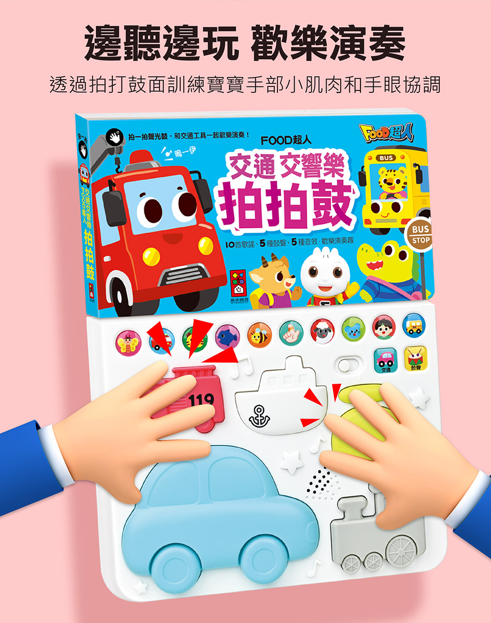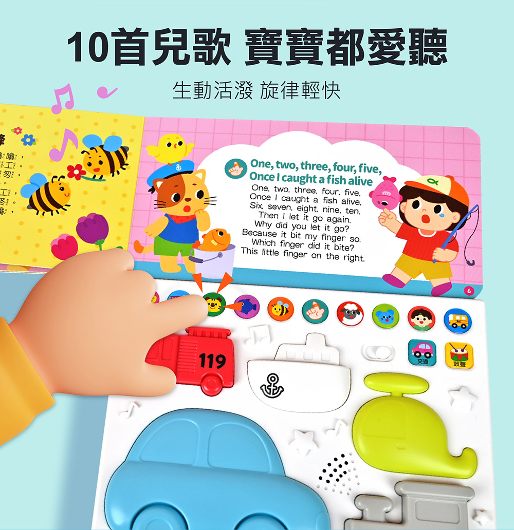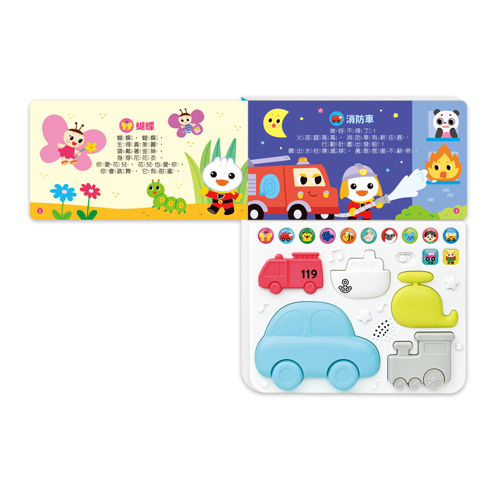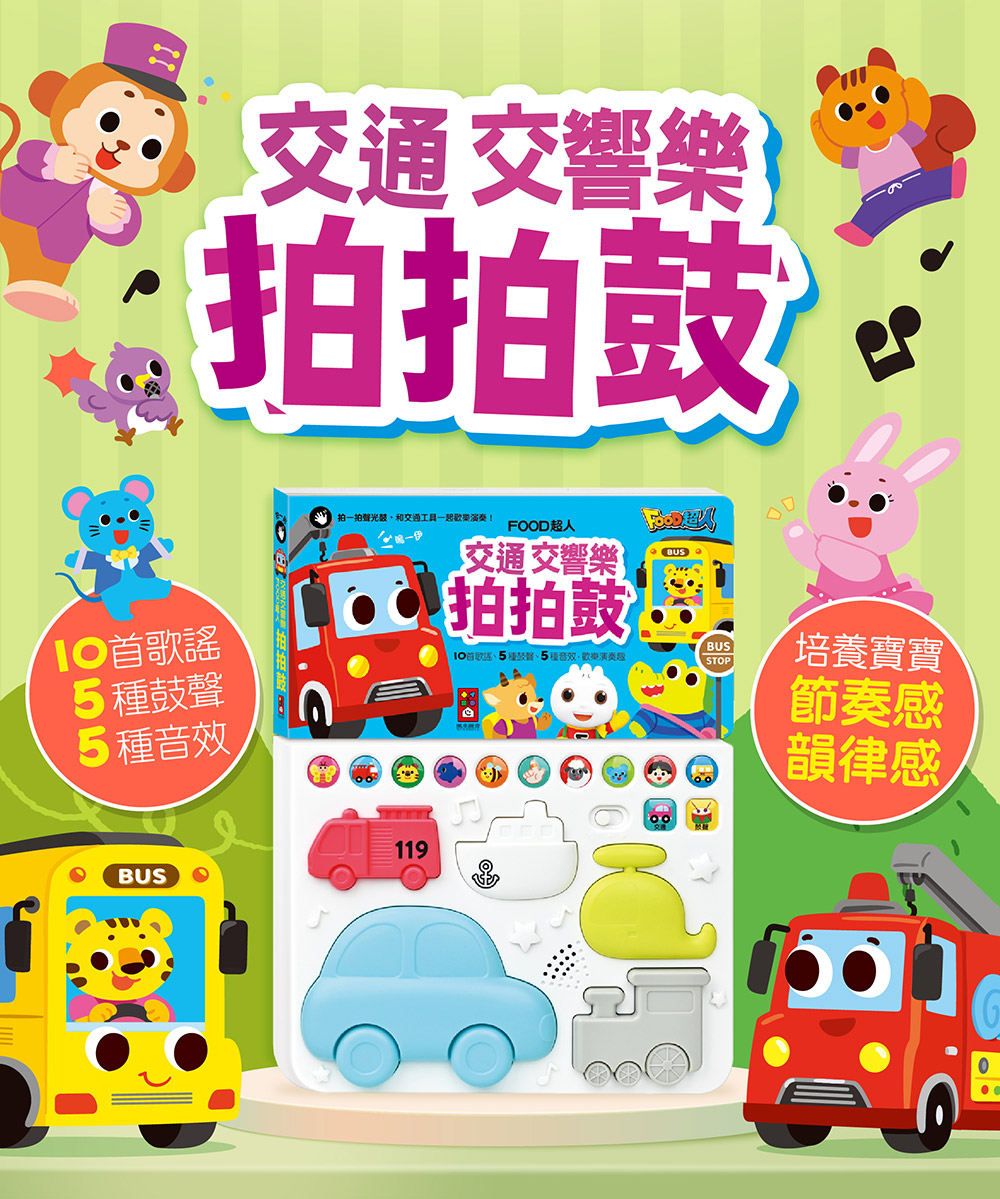 本書收錄10首朗朗上口的中英文兒歌,搭配有趣的交通工具造型拍拍鼓,簡單用手拍打便可以發出獨一無二的節奏!透過拍打鼓面訓練寶寶手部小肌肉和手眼協調,聆聽音樂跟著歌詞本哼唱 ,從小培養孩子的音樂素養。
