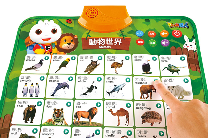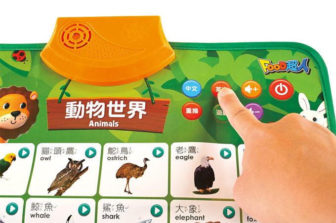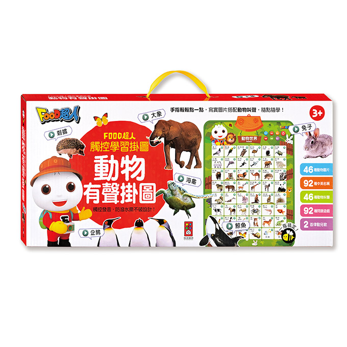 《FOOD超人觸控學習掛圖-動物有聲掛圖》幫助孩子學習46種動物,同時可學習英文單字,且搭配動物叫聲,只要手指輕輕一按即能發聲,加上多種功能鍵切換學習模式,也有問題遊戲幫助小朋友加深印象,掛圖中含有2首律動兒歌,陪伴孩子快樂成長,一起唱唱跳跳。