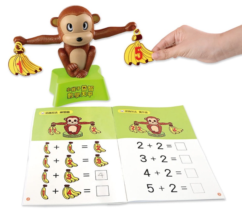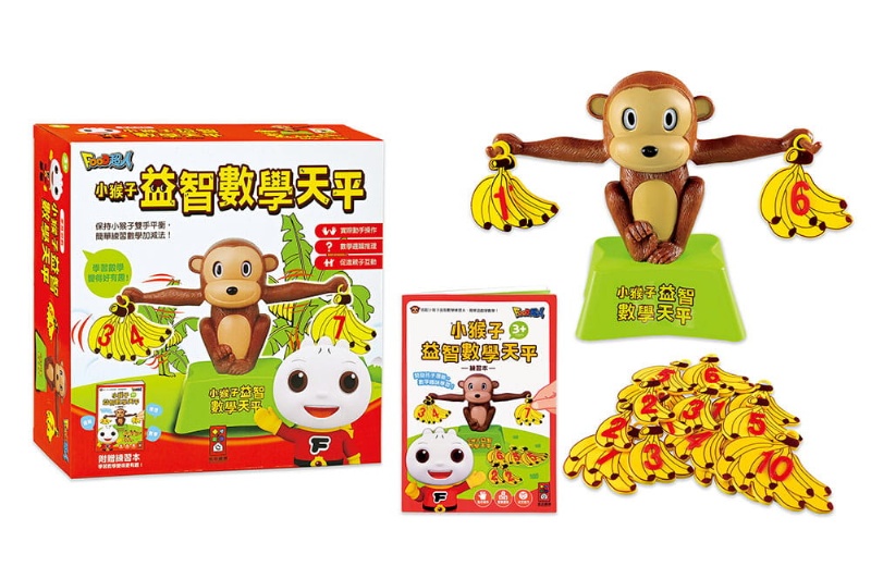 內容物:小猴子天平1個、數字香蕉15個、小猴子益智數學練習本1本