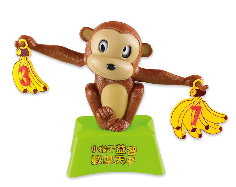 小猴子益智數學天平是兒童專用的益智型數學教具,使用猴子天平及數字香蕉,若將同數量的香蕉分別放於左右手上,猴子天平就能平衡,反之則會歪斜,除了放在天平上可以了解數的概念、基本運算之外,另外也可直接數香蕉的數量,或利用天平進行加減法、比大小,讓孩子們在遊戲中也能學習簡單數學概念與基礎運算公式。