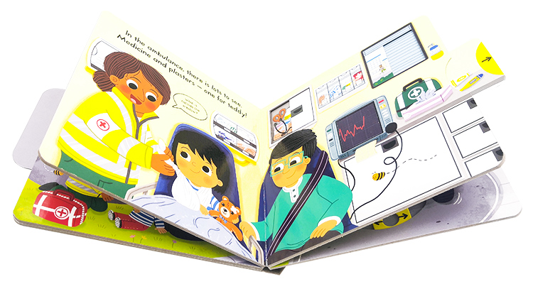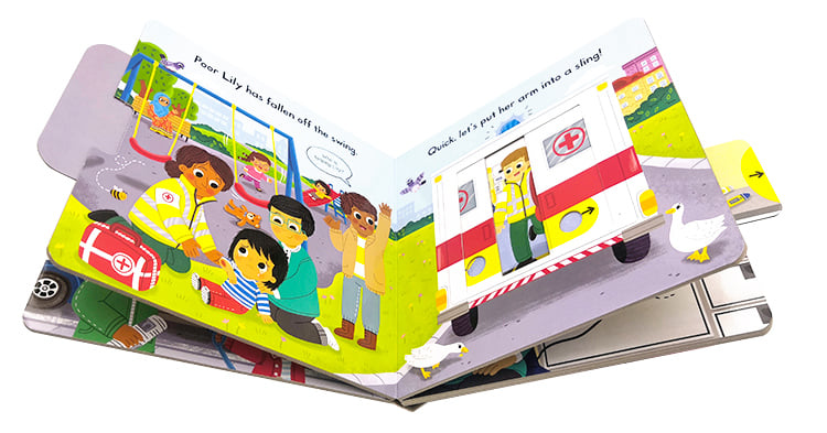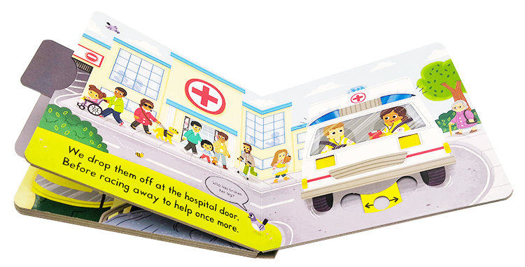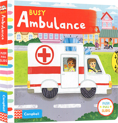 Push, pull and slide the tabs to help the Busy Ambulance on its way! Join the ambulance crew as they hurry to an accident before racing to hospital, with flashing lights and a noisy siren.