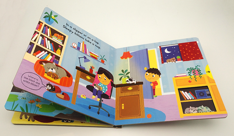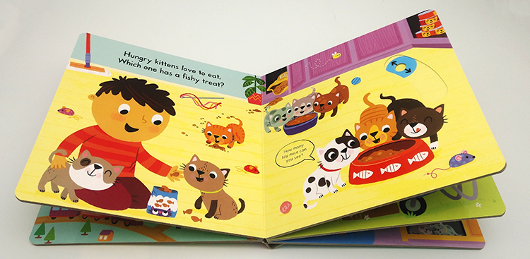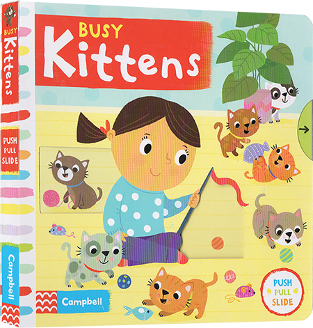 In Busy Kittens, children can have lots of fun pulling, pushing and turning the mechanisms. Join in with the fluffy kittens as they play hide and seek, scamper up trees and lick their food bowls clean.