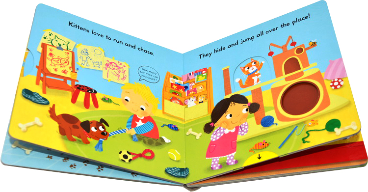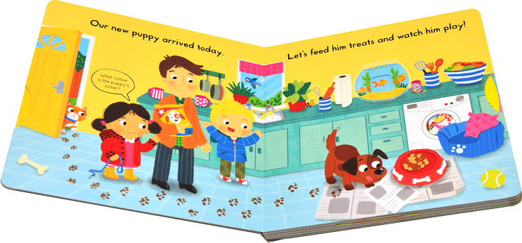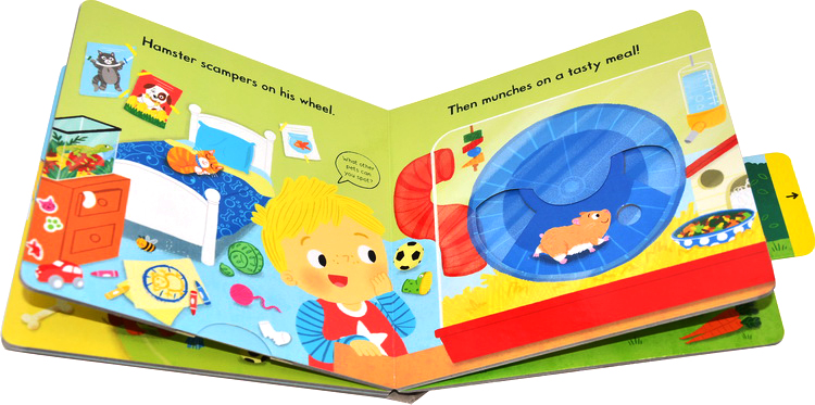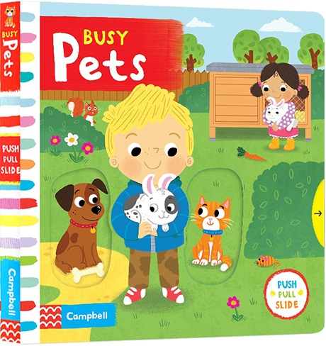 Push, pull and slide the tabs to learn about looking after Busy Pets! Feed the dog some treats, watch the hamster turn in its wheel and visit the bunny in the garden.