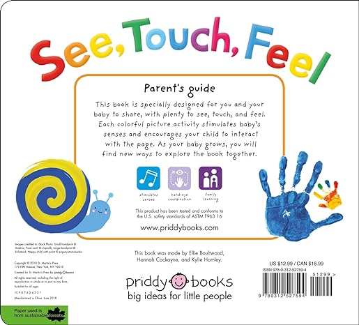 There's lots to explore in this sturdy board book specially designed to stimulate babies through sensory play. Each page has a colourful picture activity with raised textured pages to feel, finger trails to follow, and a shiny mirror to look in to. These simple activities encourage babies to interact with the book through sight, sound, and touch.